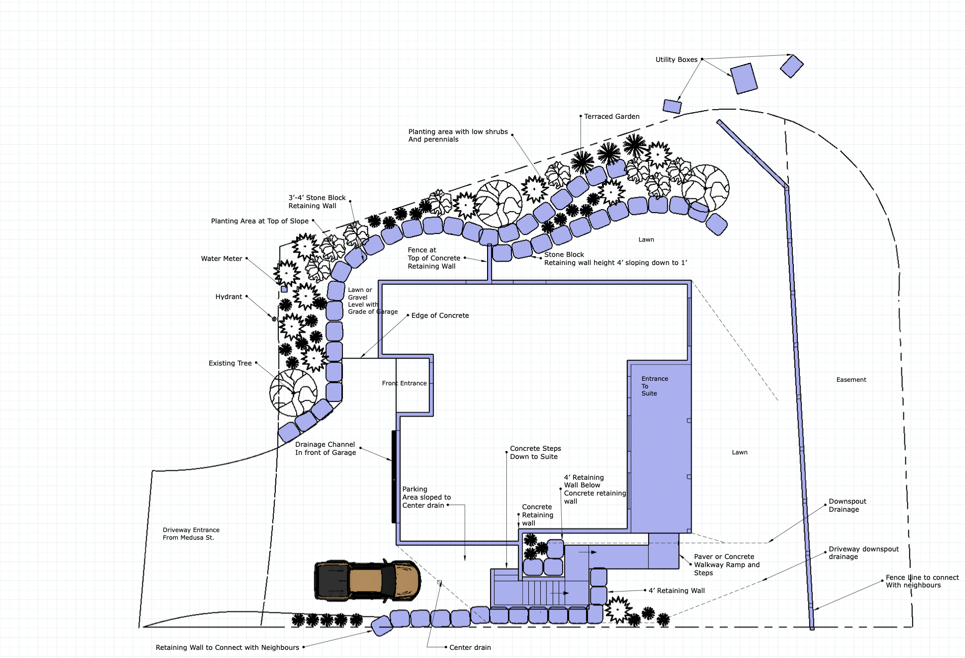 While working with a local Landscape Architect, we developed this planting plan. This was drafted in VectorWorks and includes a proposed veggie garden area, plantings to create privacy from an alley, eco-paving for parking spots, and a gathering space for outdoor events.